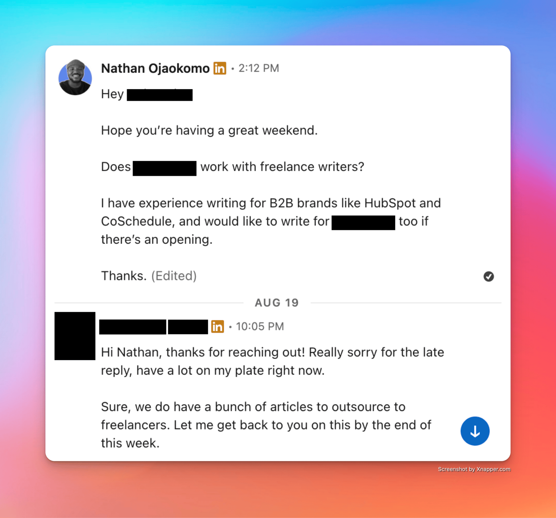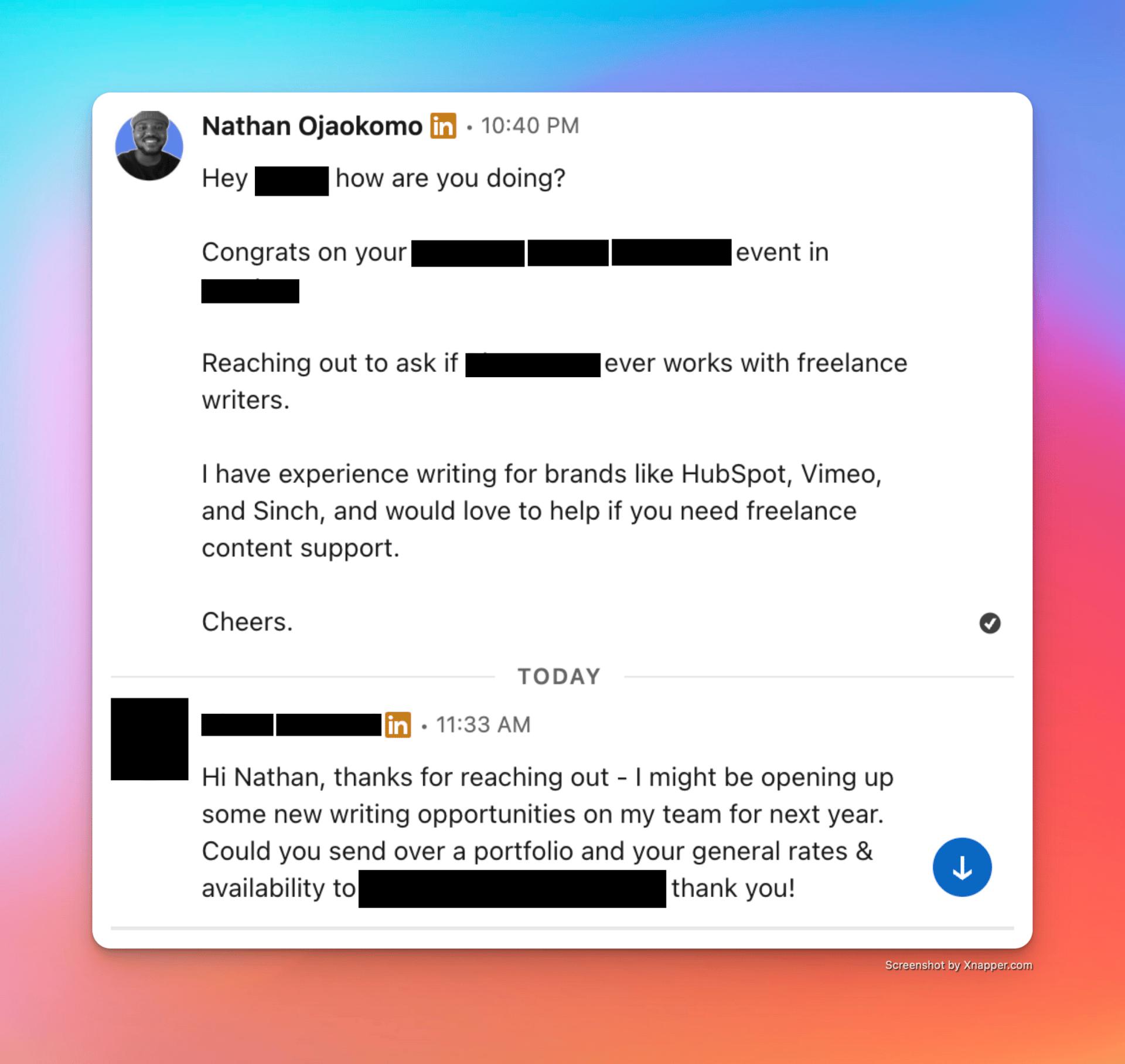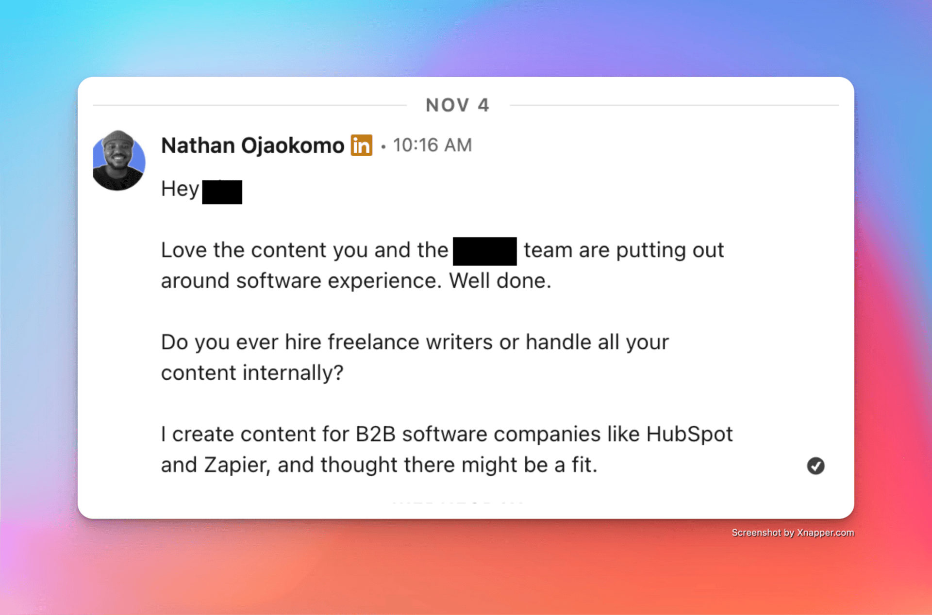 This DM is similar to the earlier cold DM, but in this case, it led to paid work. I used the same approach, asking one question about whether they work with freelancers.