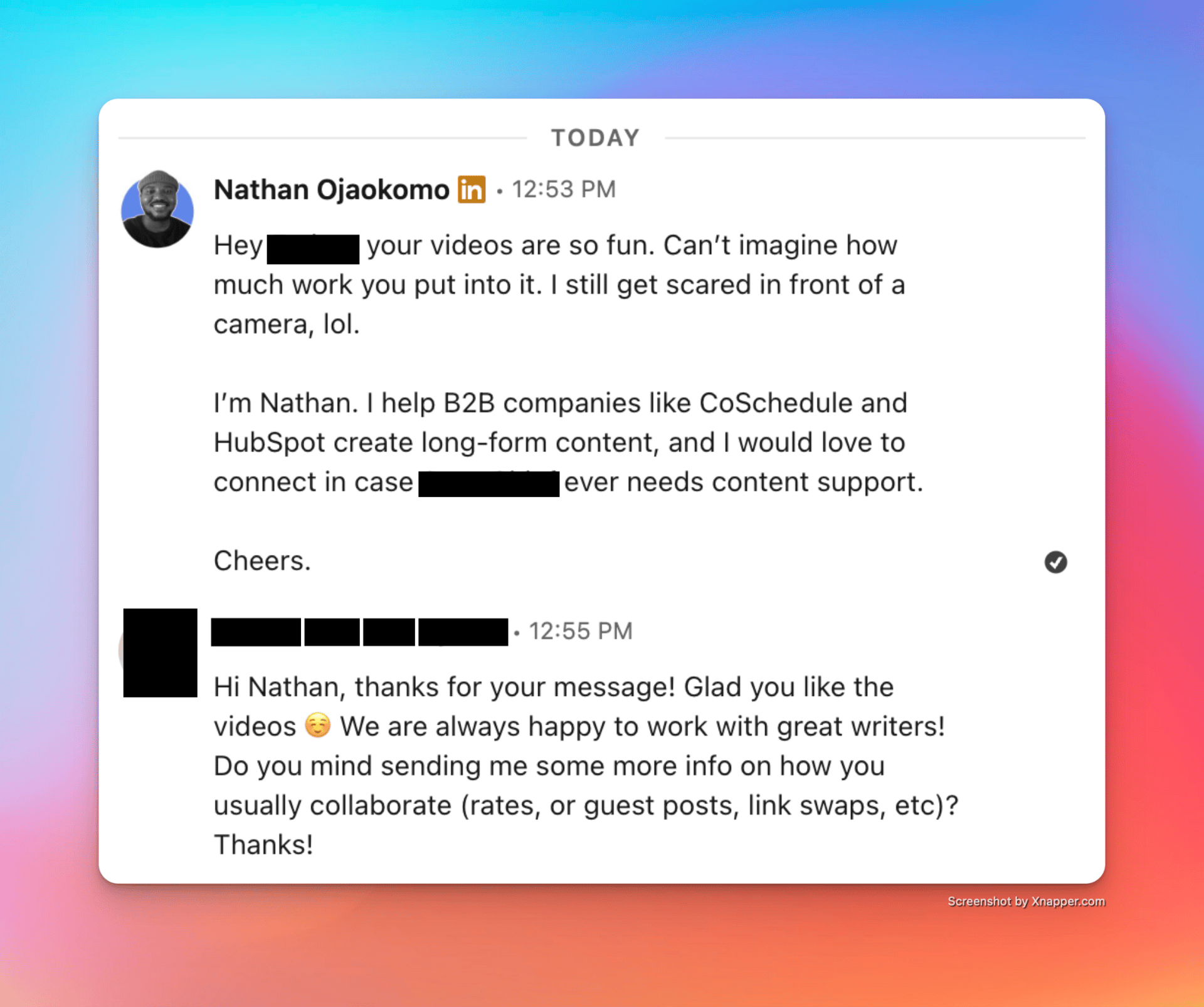 The first line was a compliment—something I put together from looking at their content for more than 2 seconds—and then my ask.